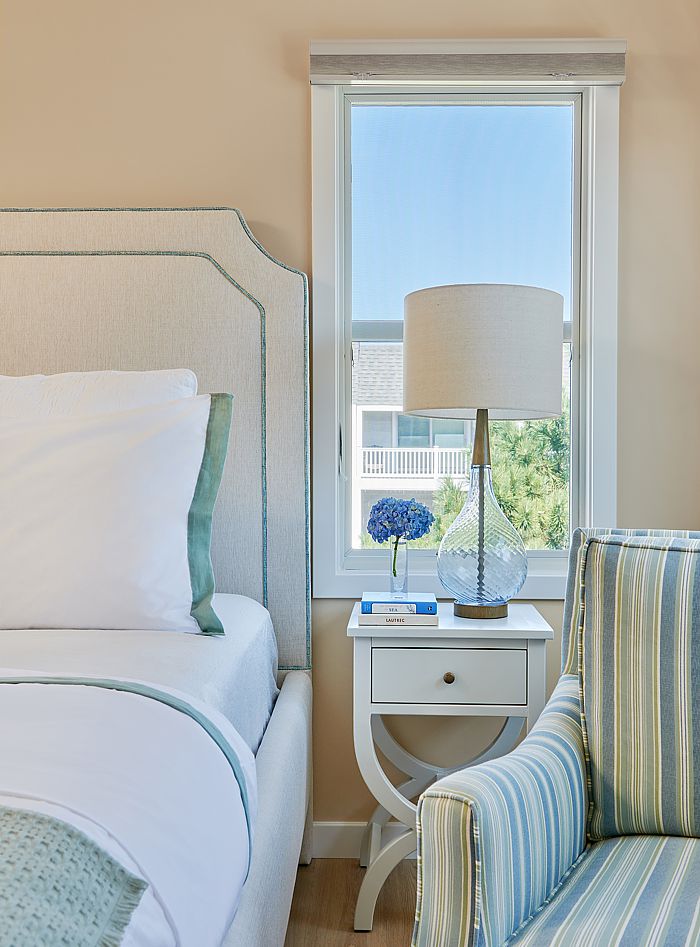 For example, if your living room leans coastal with sandy neutrals and navy, bring a lighter variation, such as a desaturated blue, into the guest room. It creates a sense of harmony through color while still giving the space its own identity.